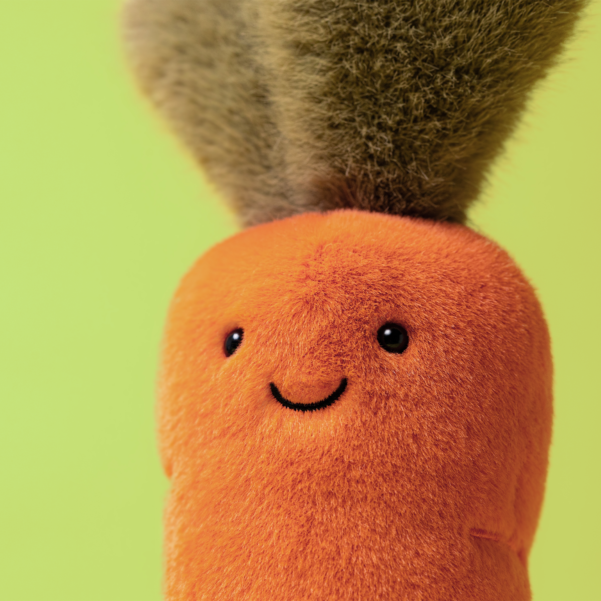 Die Amuseables Carrot von JELLYCAT bringt mit ihrem charmanten Design und der extra weichen Oberfläche sofort gute Laune in dein Zuhause. Mit ihrem freundlichen Gesicht, den niedlichen Details und dem leuchtenden Orange wird sie schnell zum absoluten Lieblingsstück – ob als Deko oder Kuschelfreund.