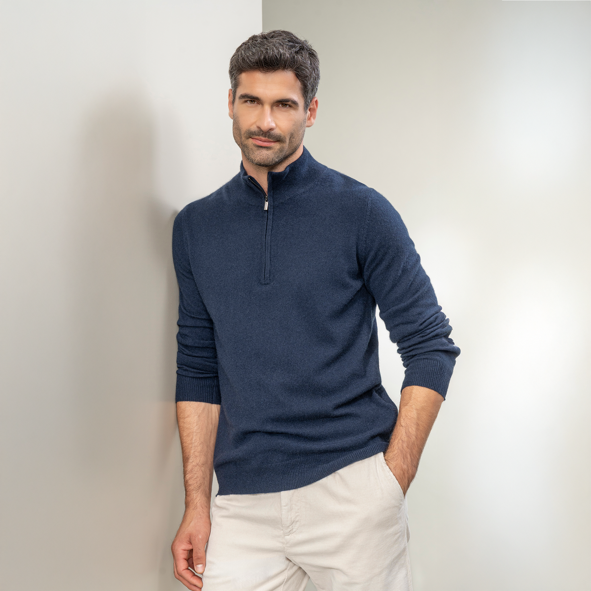 Der THE CASHMERE Troyer Pullover in Dark Navy wird dich angenehm durch die kalte Jahreszeit begleiten. Gefertigt aus 100 % nachhaltigem Cashmere, legt er sich unvergleichlich weich auf deine Haut. Funktional wird er durch den Reißverschluss, der sich bis zur Brust öffnen lässt.