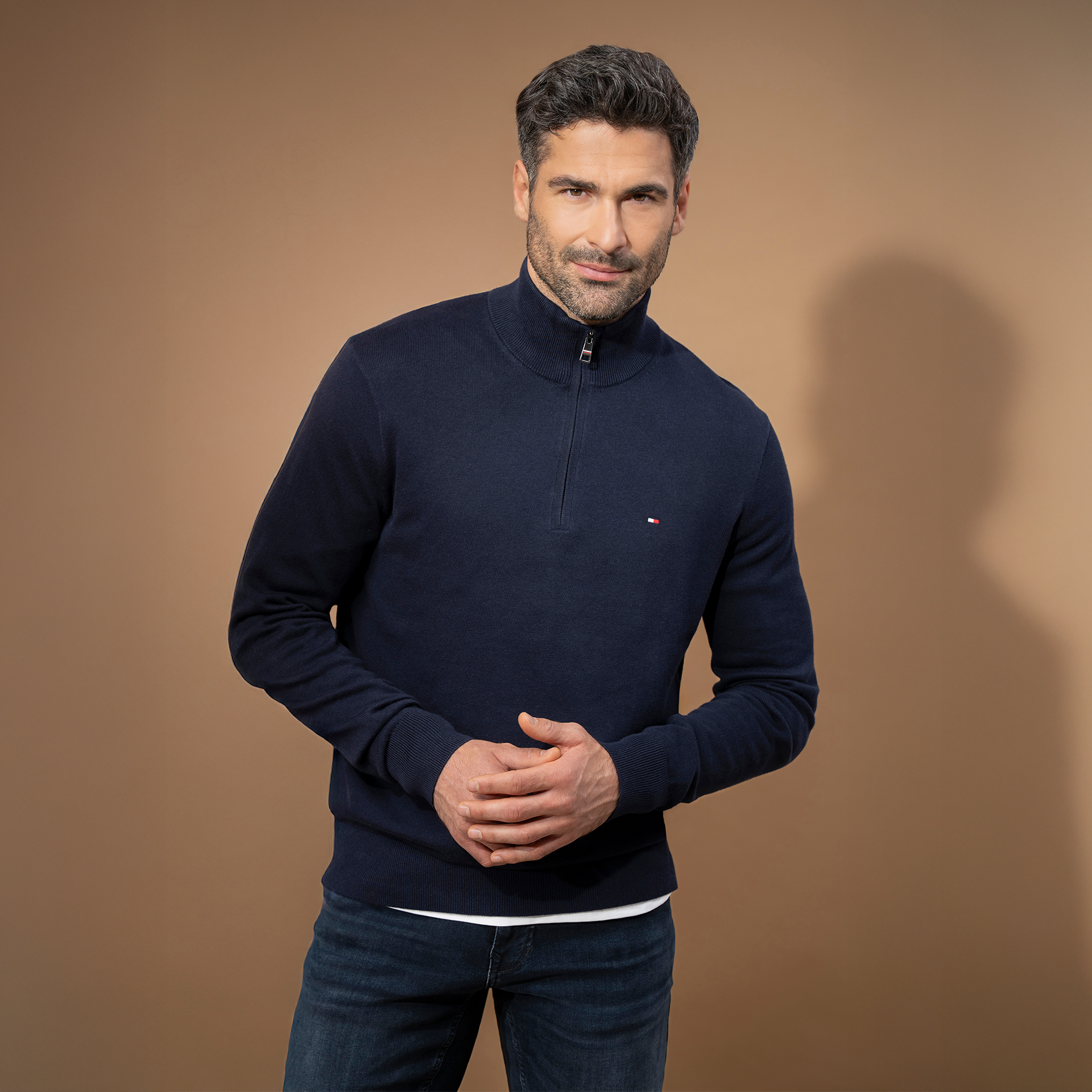 Dieser Troyer von TOMMY HILFIGER kombiniert hochwertige Materialien mit edlem, zeitlosem Design. Der weiche Mix aus Bio‑Pima‑Baumwolle und einem Hauch Cashmere sorgt für angenehmen Tragekomfort und behagliche Wärme – ideal für Herbst und Winter. Der stehende Kragen mit Reißverschluss verleiht dem Pullover eine moderne, gepflegte Note: Ob geschlossen für windige Tage oder offen für einen lässigen Look — du entscheidest. Regular Fit und dezentes Design machen ihn zu einem vielseitig kombinierbaren Piece.