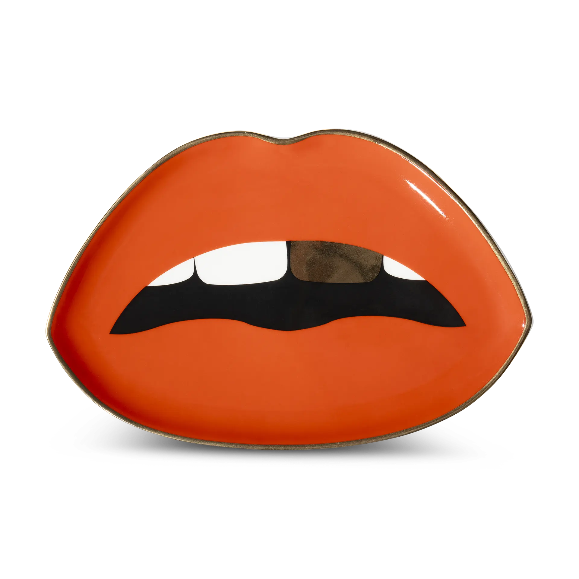 Verleihe deinem Raum einen Hauch von glamourösem Charme mit dem Lippenförmigen Tablett von Jonathan Adler. Dieses exquisite Schmucktablett ist aus hochgebranntem Porzellan gefertigt und mit edlen Blattgold-Akzenten veredelt.