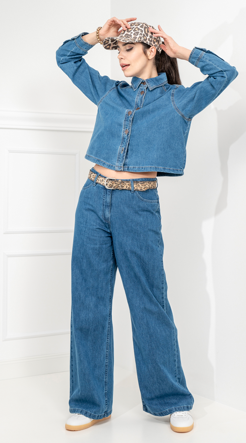 Jeans von Kopf bis Fuß? Yes, please! Der Double Denim Look bringt lässige Vibes mit einem Hauch Retro zurück. Cropped trifft auf Wide-Leg - ein cooles Spiel mit Proportionen, das deine Silhouette perfekt in Szene setzt. Leo-Details setzen edgy Akzente und machen dein Outfit zum Eyecatcher.