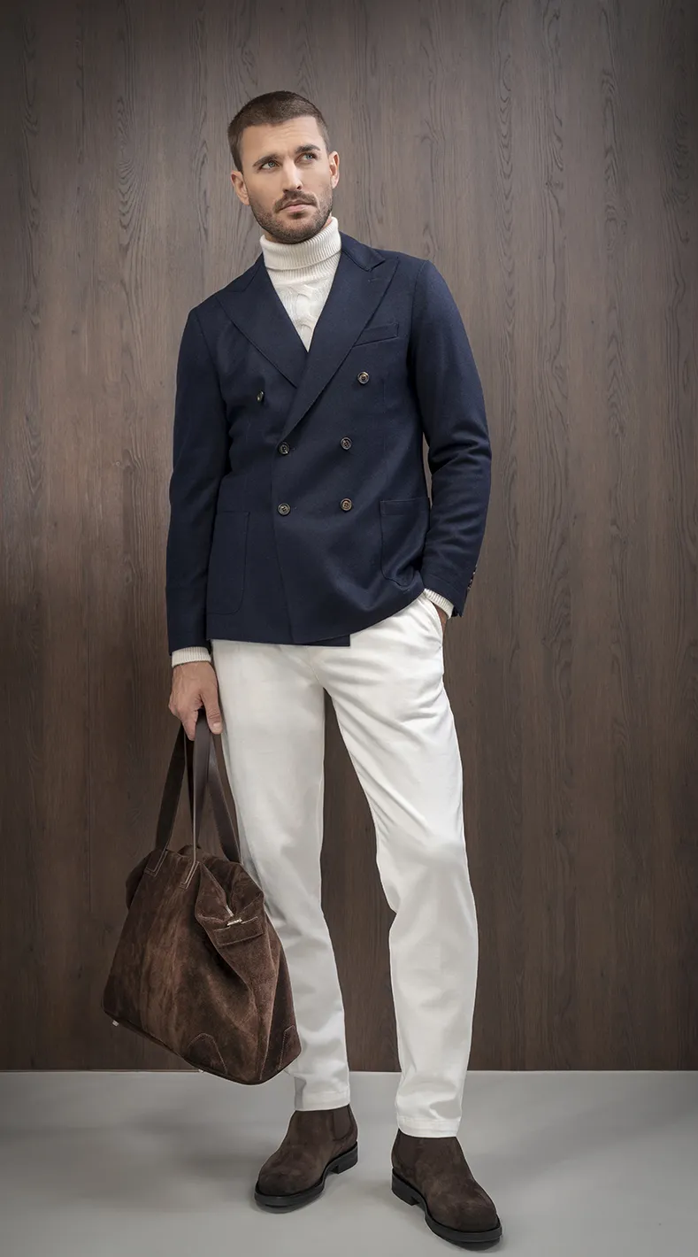 Navy Elegance ist ein Outfit, das souveräne Eleganz neu interpretiert. Das dunkelblaue ELEVENTY Sakko verleiht Struktur, während der weiche Rollkragenpullover von THE CASHMERE Komfort und Wärme bringt. Die helle ELEVENTY Chino sorgt für einen modernen Kontrast, ergänzt durch edle Chelsea-Boots von SANTONI. Der Weekender von ARMA setzt das finale Statement: ein Look, der für Büro, Dinner oder City-Trips gleichermaßen überzeugt.