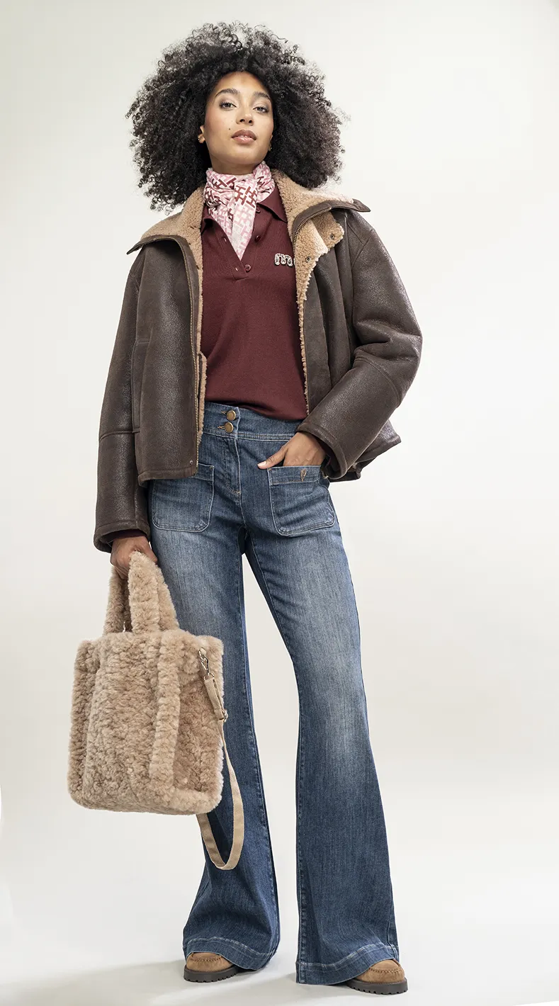 Vintage Aviator vereint eine ARMA Lederjacke mit Fellfutter, ein bordeauxfarbenes Oberteil von COPENHAGEN MUSE und Denim von SEDUCTIVE – Retro-Charme trifft modernen Trend.