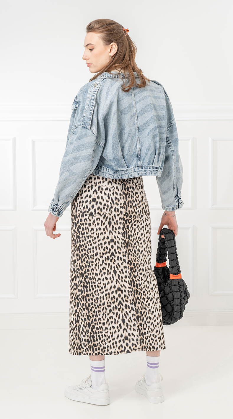 Leo trifft Denim – und der Vibe? Bold, wild & alltagstauglich! Mit Leo-Skirt, Zebra-Jacke und cleanen Essentials mixst du edgy mit casual wie ein echter Style-Pro. Ein Look für Girls, die wissen, was sie wollen.