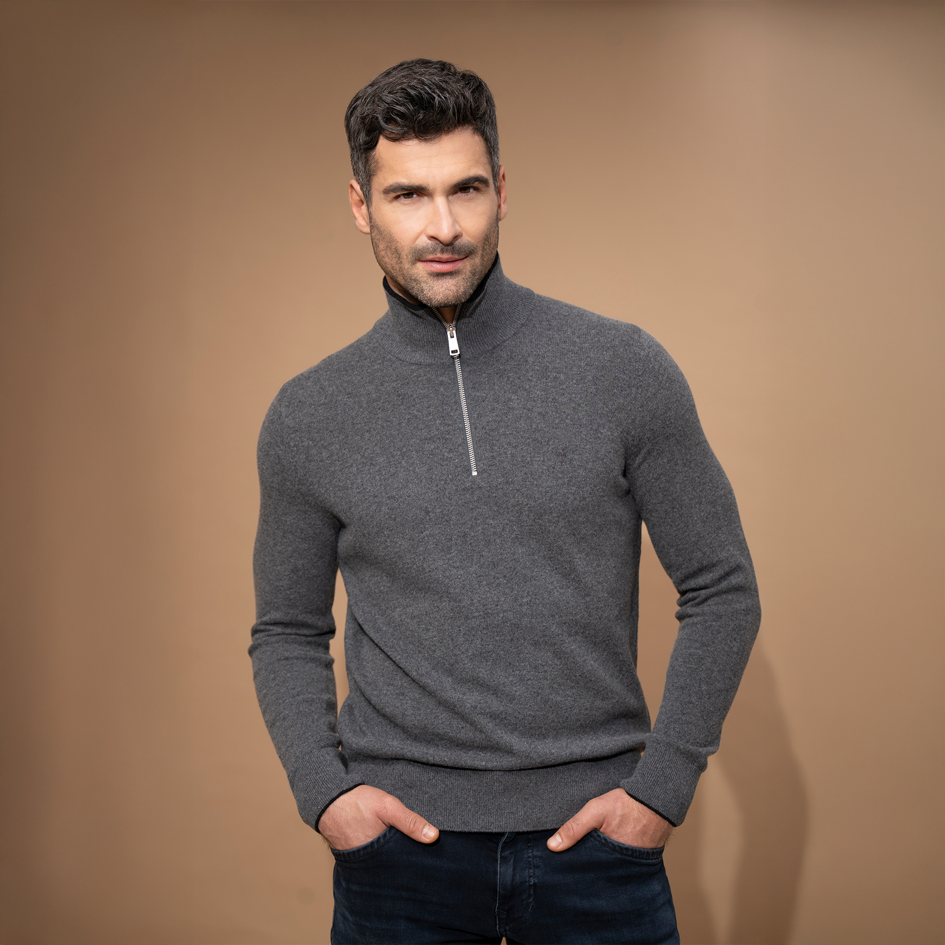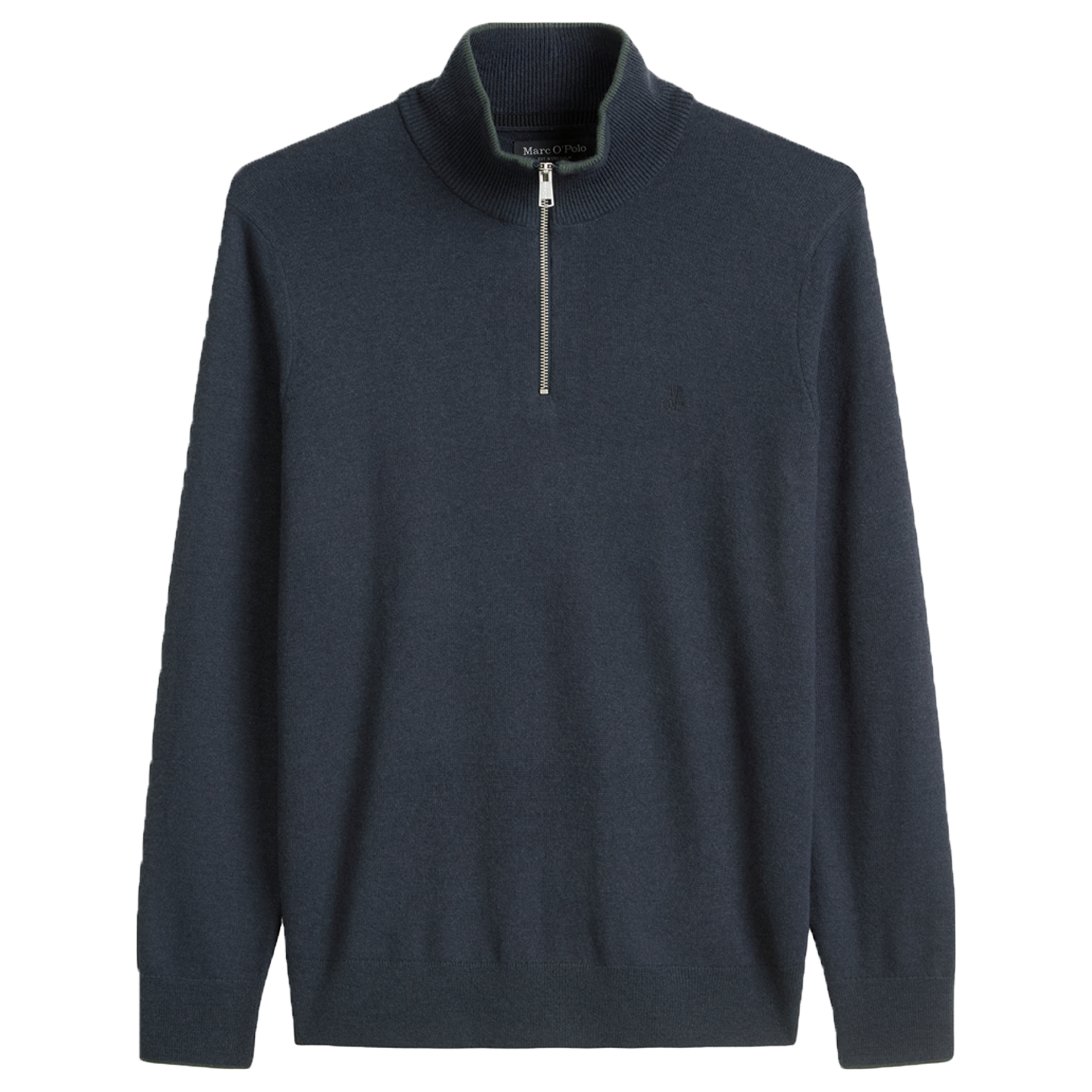 Klassischer Herren-Troyer mit markantem Kragen für kühle Tage – hochwertig, komfortabel und vielseitig einsetzbar. Der Pullover vereint einen hochwertigen Mix aus Bio-Baumwolle und Schurwolle zu einer weichen, warmen und zugleich atmungsaktiven Strickqualität. Der charakteristische Halb-Reißverschluss am Kragen ermöglicht flexibles Tragen: offen für lässige Looks oder geschlossen für zusätzliche Wärme am Hals. Die Regular-Fit-Passform mit geradem Schnitt und unaufdringlichem Maschenbild sorgt für eine gepflegte Silhouette. Mit langen Ärmeln und gerippten Bündchen an Saum und Ärmeln präsentiert sich der Troyer als klassisches Basic.